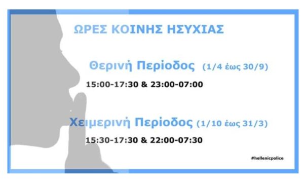 Από την 1η Οκτωβρίου 2025, εχουν τεθεί σε ισχύ οι χειμερινές ώρες κοινής ησυχίας, οι οποίες θα ισχύουν έως και τις 31 Μαρτίου 2026, σύμφωνα με την ελληνική αστυνομική νομοθεσία.
