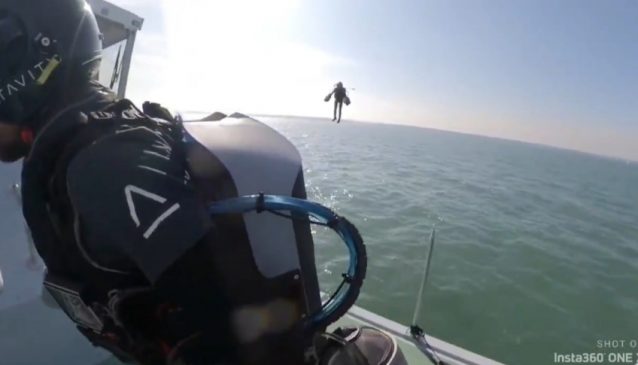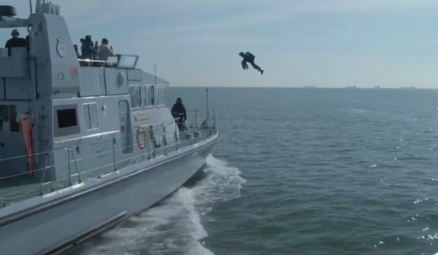 Όπως φαίνεται στο βίντεο που ανέβηκε στο Twitter, ένας άντρας εξοπλισμένος με τη στολή απογειώνεται από μια βάρκα και προσγειώνεται με επιτυχία σε ένα διπλανό πολεμικό σκάφος, για να επιστρέψει στη συνέχεια στην αφετηρία του.