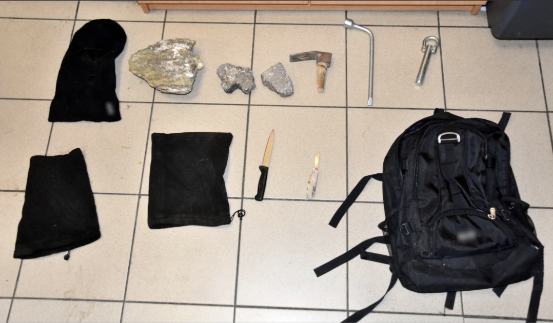 Ο συλληφθείς στη θέα των αστυνομικών τράπηκε σε φυγή, ενώ από την κατοχή του και από σακίδιο που έφερε, κατασχέθηκαν μαχαίρι, πέτρες, σκεπάρνι κ.α.