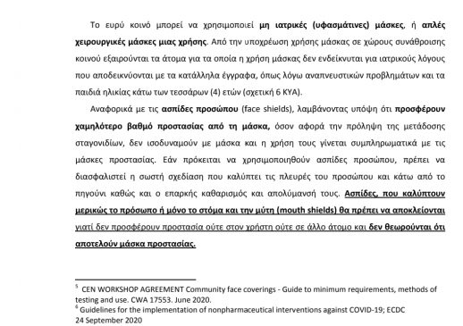 Σύμφωνα με την εγκύκλιο του υπουργείου υγείας με αριθμό Πρωτ. Δ1α/ΓΠ οικ 67851 από 22.10.2020 (ΑΔΑ:6Φ3Ι465ΦΥΟ-ΤΗΙ), επισημαίνει ότι αναφορικά με τις ασπίδες προσώπου (face shields), λαμβάνοντας υπόψη ότι προσφέρουν