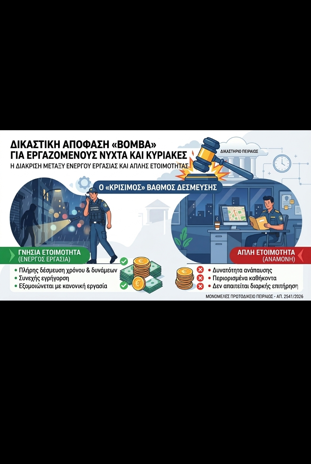 Εικόνα αρχείου creation.ai. Uniformnews Newsroom. Δικαστική απόφαση «βόμβα» για όσους εργάζονται νύχτα και Κυριακές Μια ιδιαίτερα κρίσιμη απόφαση για το καθεστώς απασχόλησης των νυχτοφυλάκων αλλά και για ευρύτερες κατηγορίες εργαζομένων που βρίσκονται σε καθεστώς «ετοιμότητας» εξέδωσε το Μονομελές Πρωτοδικείο Πειραιώς, ανοίγοντας μια συζήτηση που αναμένεται να έχει συνέχεια τόσο σε νομικό όσο και σε εργασιακό επίπεδο. Με την υπ’ αριθμ. 2541/2026 απόφασή του, το δικαστήριο έκρινε ότι νυχτοφύλακας εργοταξίου δεν δικαιούται προσαυξήσεις για νυχτερινή εργασία, υπερεργασία, υπερωρίες, ούτε επιπλέον αποζημίωση για εργασία κατά τις Κυριακές και αργίες,…