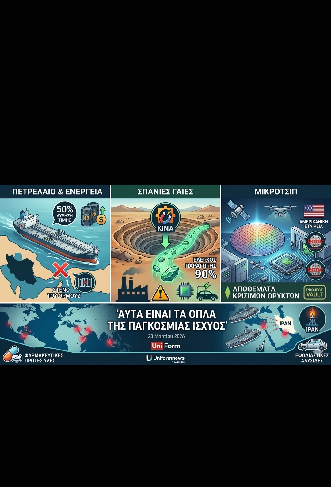Εικόνα αρχείου creation.ai. Uniformnews Newsroom. Αντιμέτωπη με επιθέσεις από τις ΗΠΑ και το Ισραήλ, η Τεχεράνη έχει εξαπολύσει μια ασύμμετρη αντεπίθεση, χρησιμοποιώντας τις ενεργειακές προμήθειες ως «όπλο». Η κίνηση του Ιράν να αποκόψει το Στενό του Ορμούζ και να μετατρέψει το πετρέλαιο σε όπλο πολέμου σηματοδοτεί μια νέα φάση στον ανταγωνισμό του 21ου αιώνα για την παγκόσμια ισχύ — μια φάση που θα καθοριστεί από τον έλεγχο κρίσιμων πρώτων υλών και της ενέργειας, σύμφωνα με τη Wall Street Journal. Αντιμέτωπη με μια σφοδρή εκστρατεία αεροπορικών επιδρομών από τις ΗΠΑ και το Ισραήλ, η Τεχεράνη…