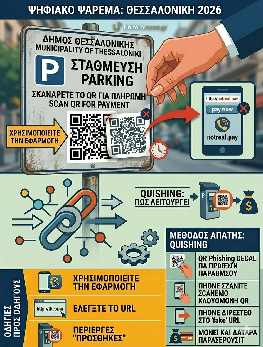 . Εικόνα αρχείου creation.ai. Uniformnews Newsroom. «Ψηφιακό Ψάρεμα» στη Βασιλίσσης Όλγας: Πώς ο 38χρονος «παγίδευσε» το THESi με πλαστά QR Codes Μια πρωτοφανή υπόθεση ψηφιακής απάτης με «άρωμα» υψηλής τεχνολογίας εξιχνίασαν οι αστυνομικοί της Ομάδας «Ζ» σε συνεργασία με τη Δημοτική Αστυνομία Θεσσαλονίκης. Η σύλληψη ενός 38χρονου Ρουμάνου το βράδυ της Τρίτης, 31 Μαρτίου, αποκάλυψε μια καλοστημένη επιχείρηση υποκλοπής χρημάτων από ανυποψίαστους οδηγούς που προσπαθούσαν να σταθμεύσουν νόμιμα στη Λεωφόρο Βασιλίσσης Όλγας. Το «κόλπο» με τις πινακίδες-μαϊμού Ο δράστης δεν περιορίστηκε σε απλά αυτοκόλλητα. Σύμφωνα με την αστυνομική…
